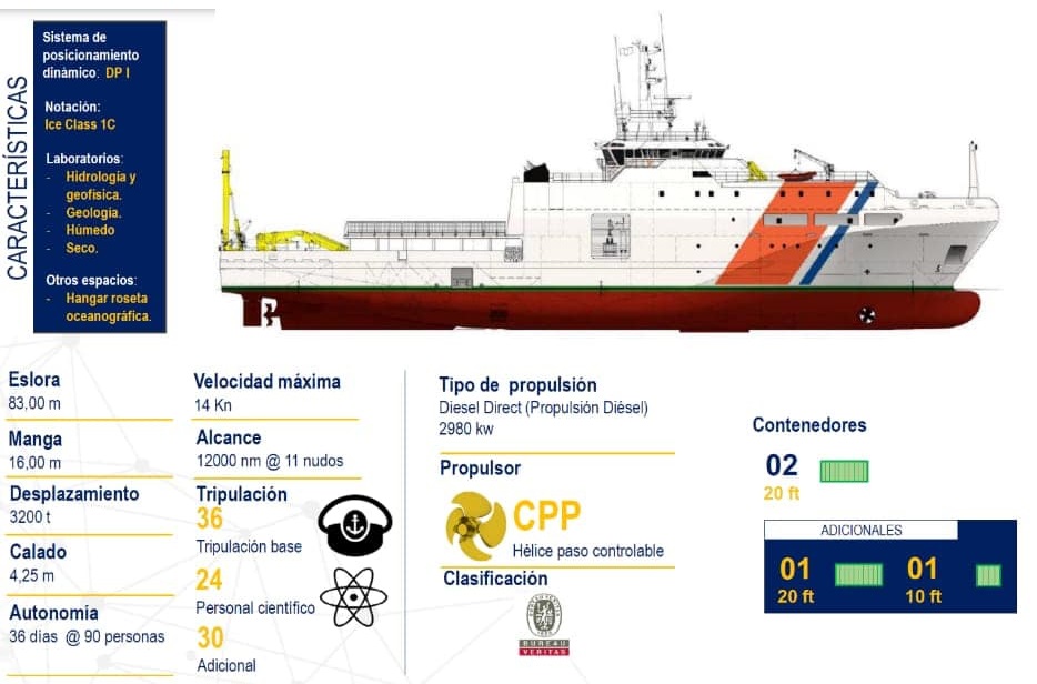 Entregado a la Armada Nacional a mediados de 2022, el ARC Simón Bolívar es un buque de 83 metros de eslora por 16 metros de manga, con un calado de 4,25 metros y unas 3.200 toneladas de desplazamiento. Equipado con dos motores diésel Caterpillar de 1.491 kW cada uno, el buque puede desplazarse a una velocidad máxima de 13 nudos gracias a sus dos hélices de paso controlable de 2,6 metros de diámetro, conectadas a los motores mediante reductoras Reintjes. A la velocidad de crucero de 11 nudos, el buque tiene una autonomía de 30 días con 90 personas a bordo, entre tripulantes, científicos y personal adicional. El Simón Bolivar ha sido diseñado para cumplir con los requisitos de emisión de ruido radiado al agua Silent(A) de DNV y con los requisitos de cota de hielo Ice Class 1C FS de LRS, que le permitirán navegar en la Antártida en condiciones de hielo liviano en el verano antártico.