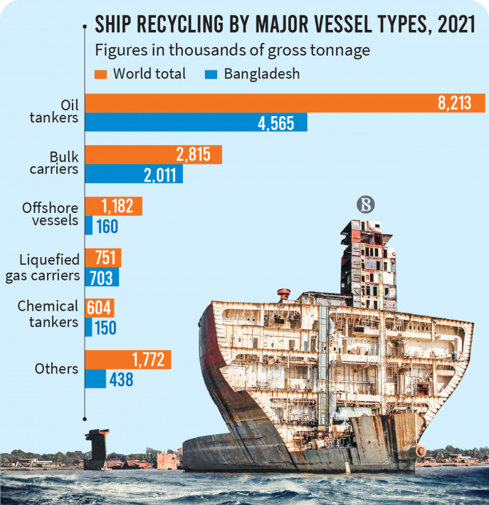 Bangladés se mantiene como el primer país en reciclaje de barcos con más de la mitad de los barcos del mundo reciclados allí según un informe de la Conferencia de las Naciones Unidas sobre Comercio y Desarrollo (UNCTAD).