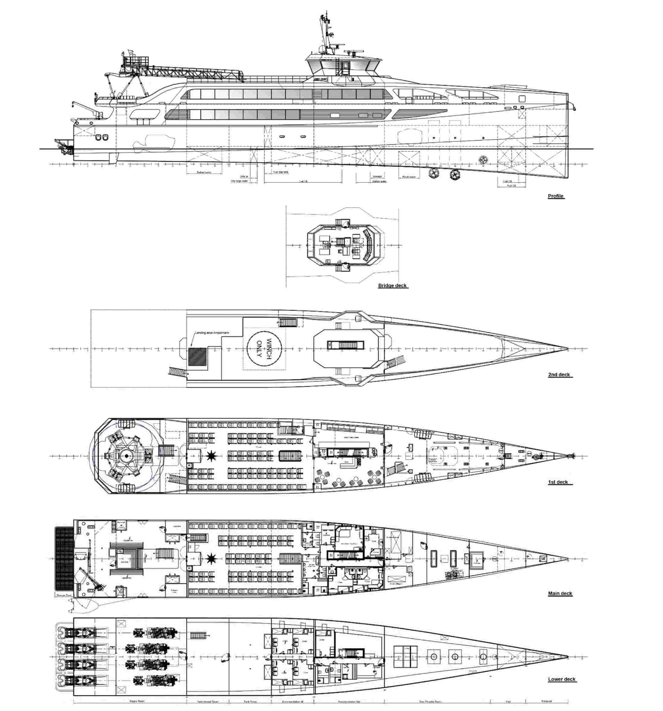Para minimizar la sensación de movimiento durante la travesía, los asientos de los técnicos transportados se han colocado en el centro de la eslora. Además de los 122 asientos reclinables, repartidos entre la cubierta principal y la inmediatamente superior, los técnicos pueden disfrutar a bordo de un bar y un comedor, aire acondicionado, Wi-Fi o un sistema de entretenimiento que ofrece vídeo o música bajo demanda. Los camarotes de la tripulación, así como los espacios técnicos del buque, se reparten entre la cubierta principal y la cubierta inferior.