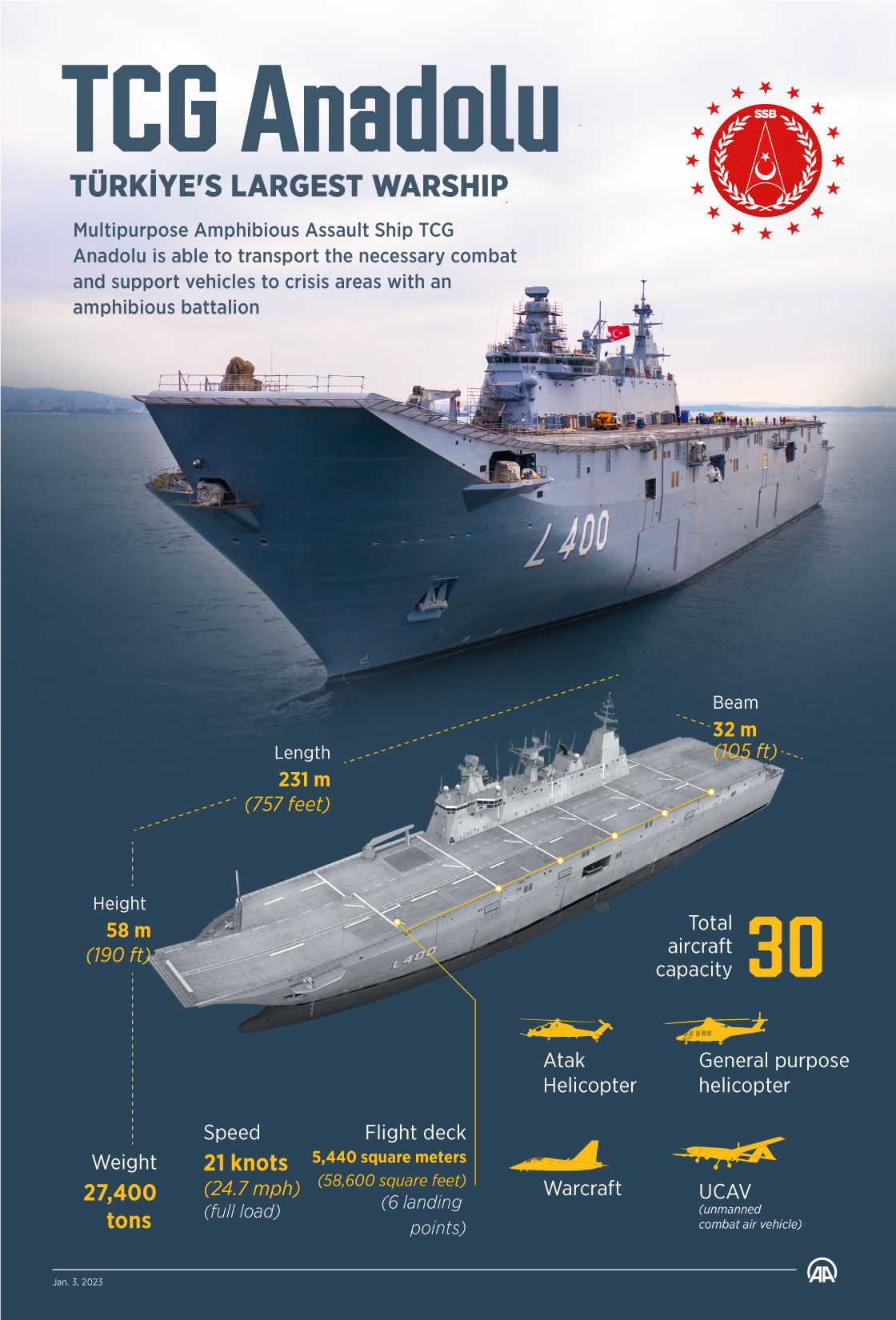 Infografía: TCG Anadolu, Türkiye’s largest warship Juan A Oliveira / 25/01/2023 También te puede interesar: Infografía: Así es el CNV-68 USS Nimitz por Juan A Oliveira 31/05/202326/05/2023 Infografía: Fujian, el súper portaviones chino por Juan A Oliveira 24/05/202326/05/2023 Infografía: Portaaviones Príncipe de Asturias R11 por Juan A Oliveira 08/03/202302/03/2023 Cargar más entradas Se ha producido un error. Actualiza la página y/o inténtalo de nuevo. Direcciu00f3n de correo electru00f3nico Suscribirse Únete a otros 793 suscriptores Si te ha gustado, compártelo: Compartir en X (Se abre en una ventana nueva) X Comparte en Facebook (Se abre en una ventana nueva) Facebook Compartir en LinkedIn (Se abre en una ventana nueva) LinkedIn Compartir en Reddit (Se abre en una ventana nueva) Reddit Compartir en WhatsApp (Se abre en una ventana nueva) WhatsApp Más Enviar un enlace a un amigo por correo electrónico (Se abre en una ventana nueva) Correo electrónico Imprimir (Se abre en una ventana nueva) Imprimir Me gusta Cargando...