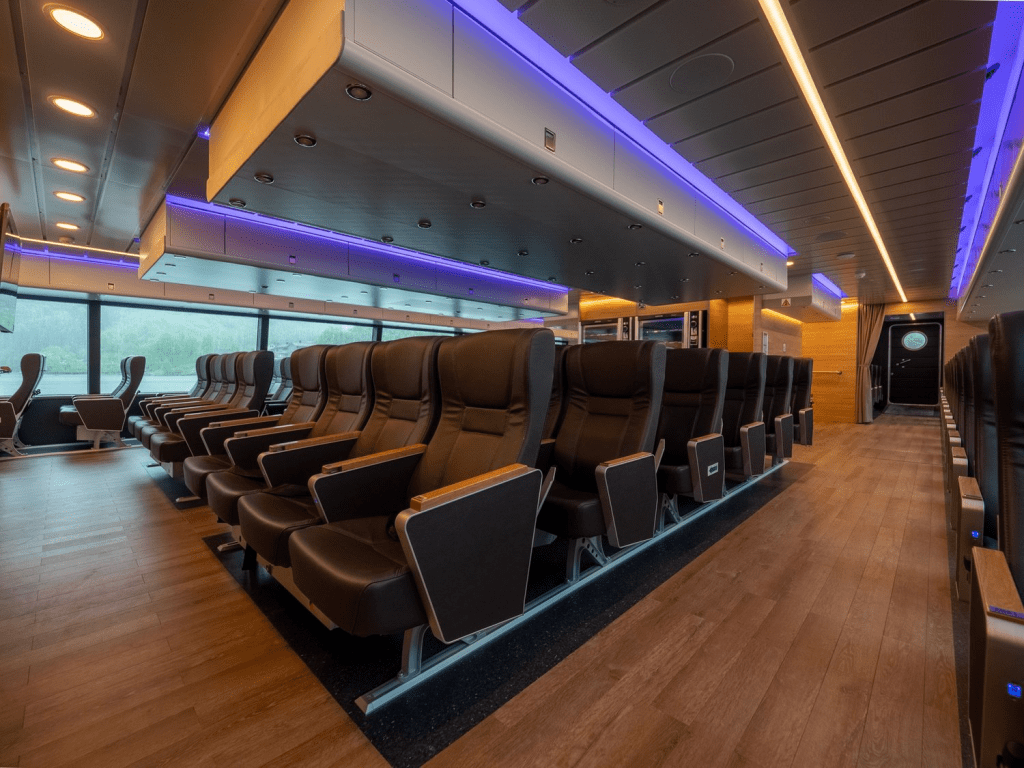 En el interior los pasajeros pueden disfrutar de amplios espacios con grandes ventanas que permiten contemplar el paisaje y la entrada de luz natural. También se han tenido en cuenta las necesidades de los personas con movilidad reducida, así como se han facilitado espacios para el estacionamiento de bicicletas a bordo o para las mascotas de los pasajeros.