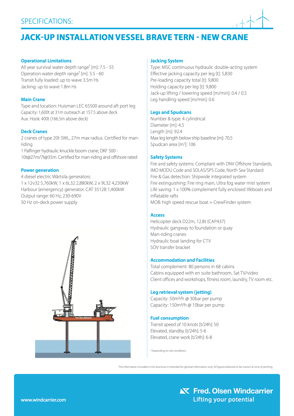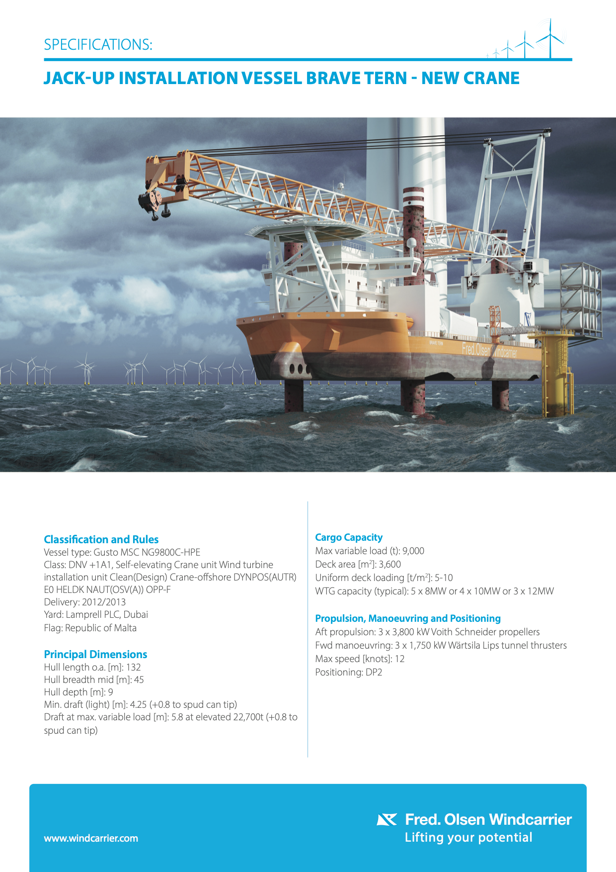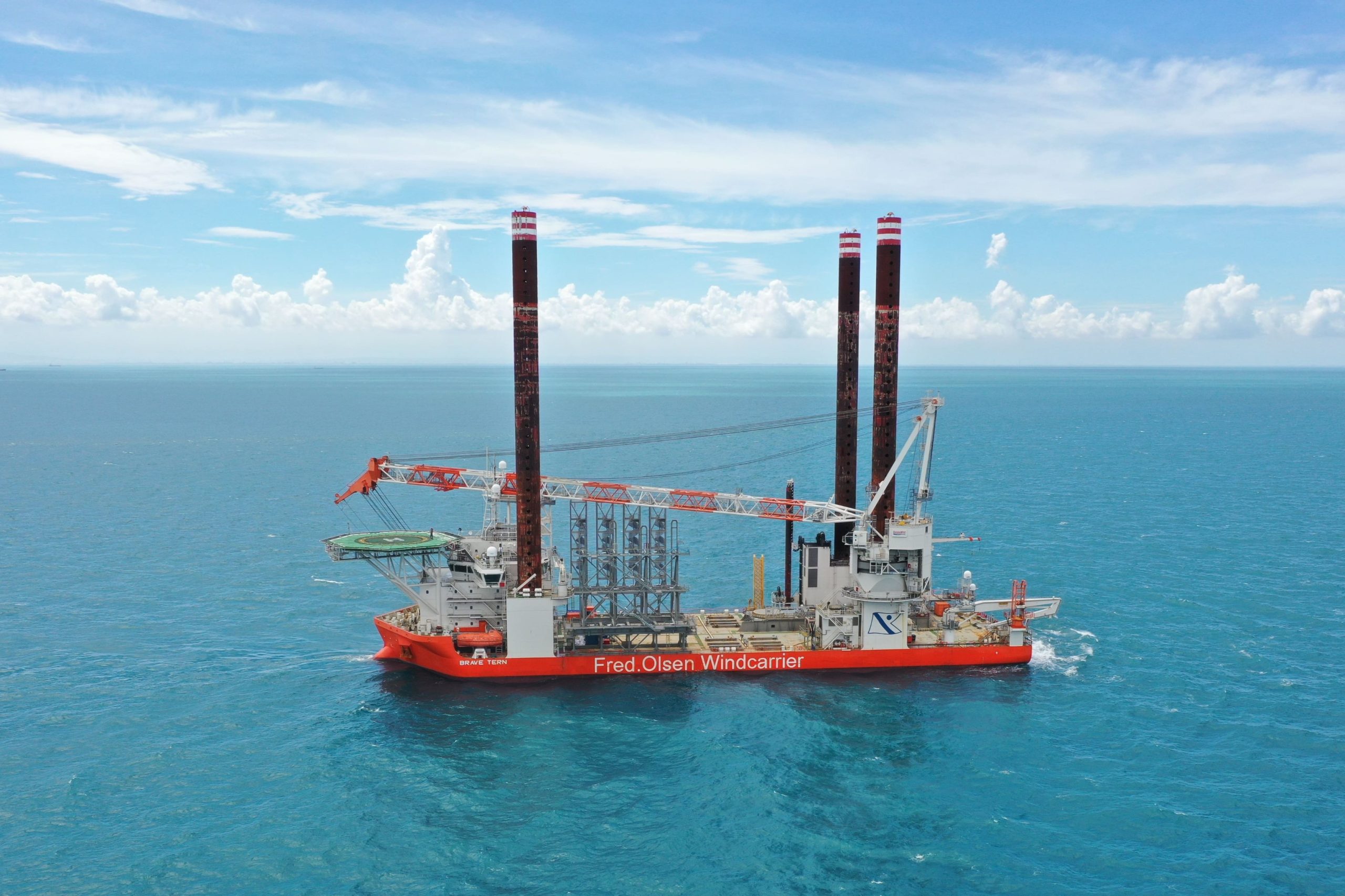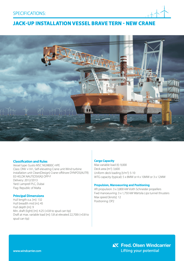 Para no quedarse atrás en este mercado, Fred Olsen Windcarrier ha decidido ampliar las capacidades de uno de sus buques instaladores, el Brave Tern, en el astillero de Navantia en Ferrol. Construido en el astillero de Lamprell en Jebel Ali (Dubái) en 2012 siguiendo el diseño NG-9000 de la compañía neerlandesa GustoMSC, el Brave Tern es el mayor buque de su tipo construido en Oriente Próximo. Sus dimensiones son de 132 metros de eslora por 45 metros de manga, con una cubierta de carga de 3.600 metros cuadrados sobre la que puede transportar hasta 9.000 toneladas. Una vez en el lugar de trabajo, el buque puede elevarse sobre sus cuatro patas hasta 30 metros sobre la superficie del mar y desde allí, a salvo de las olas, instalar las turbinas o sus componentes gracias a su grúa de 1.600 toneladas de capacidad de elevación a una distancia máxima de 31 metros y a 157,5 metros por encima de la cubierta del buque.