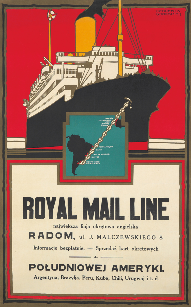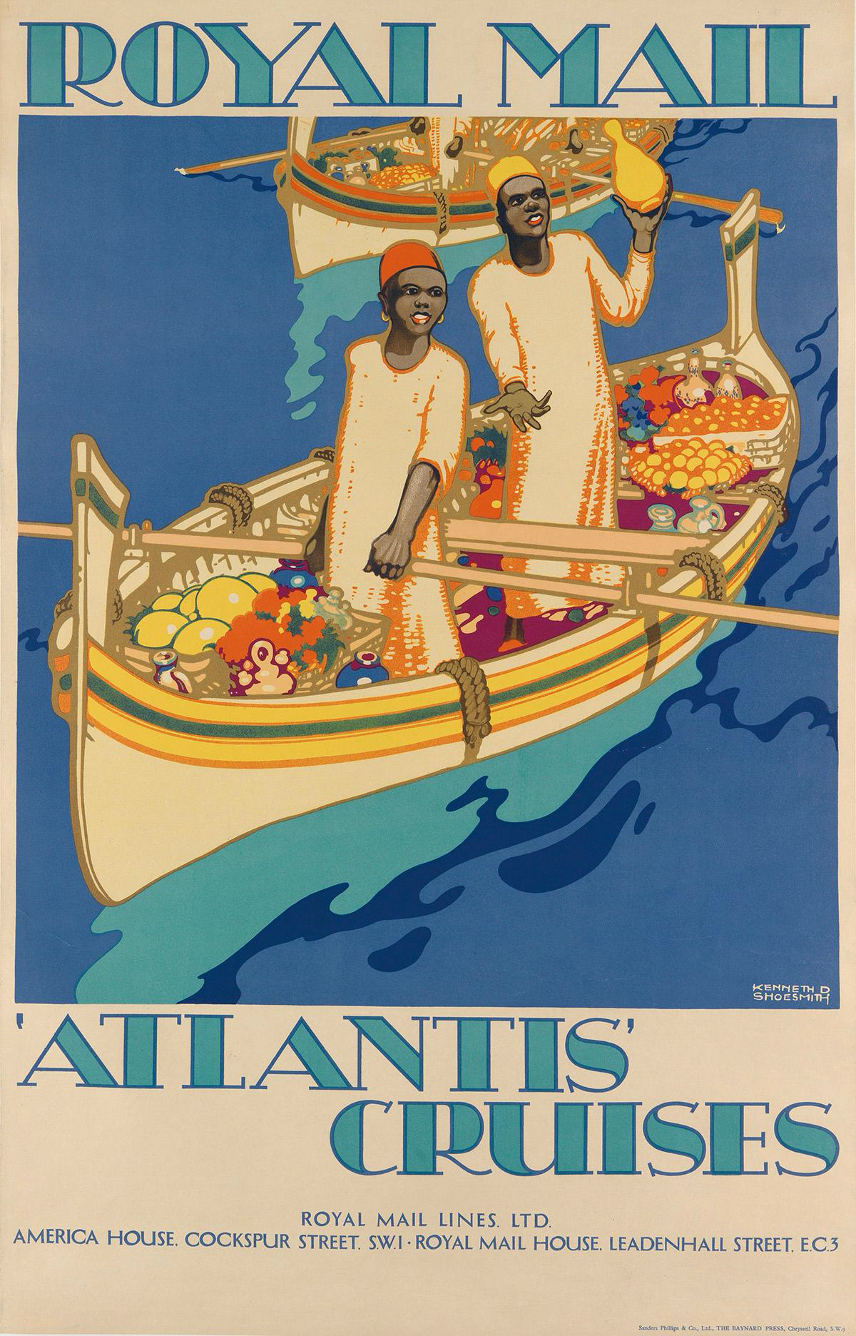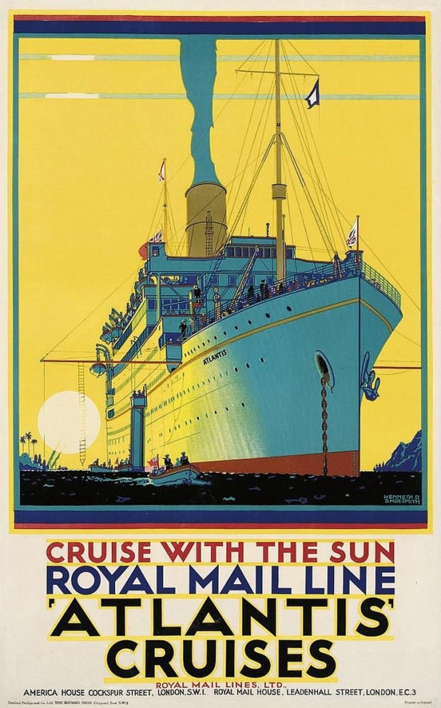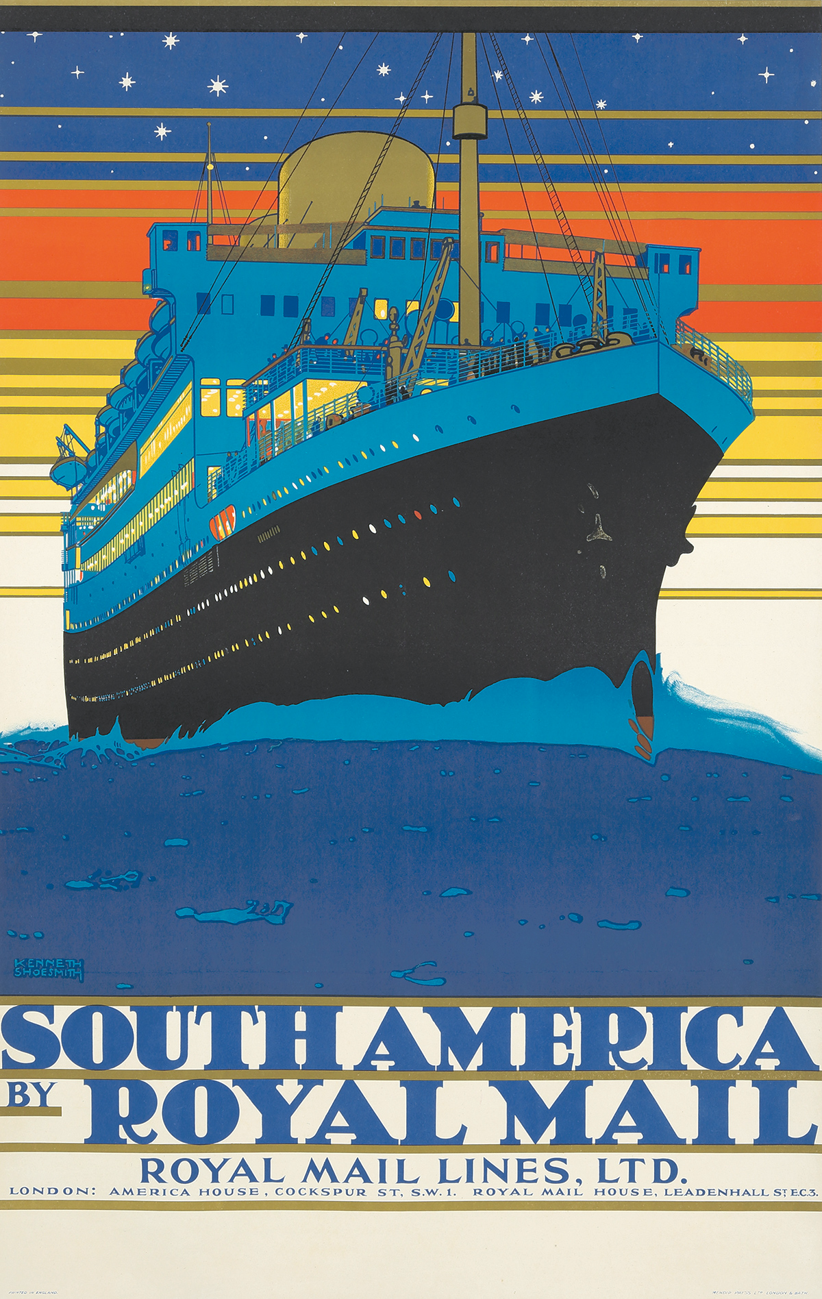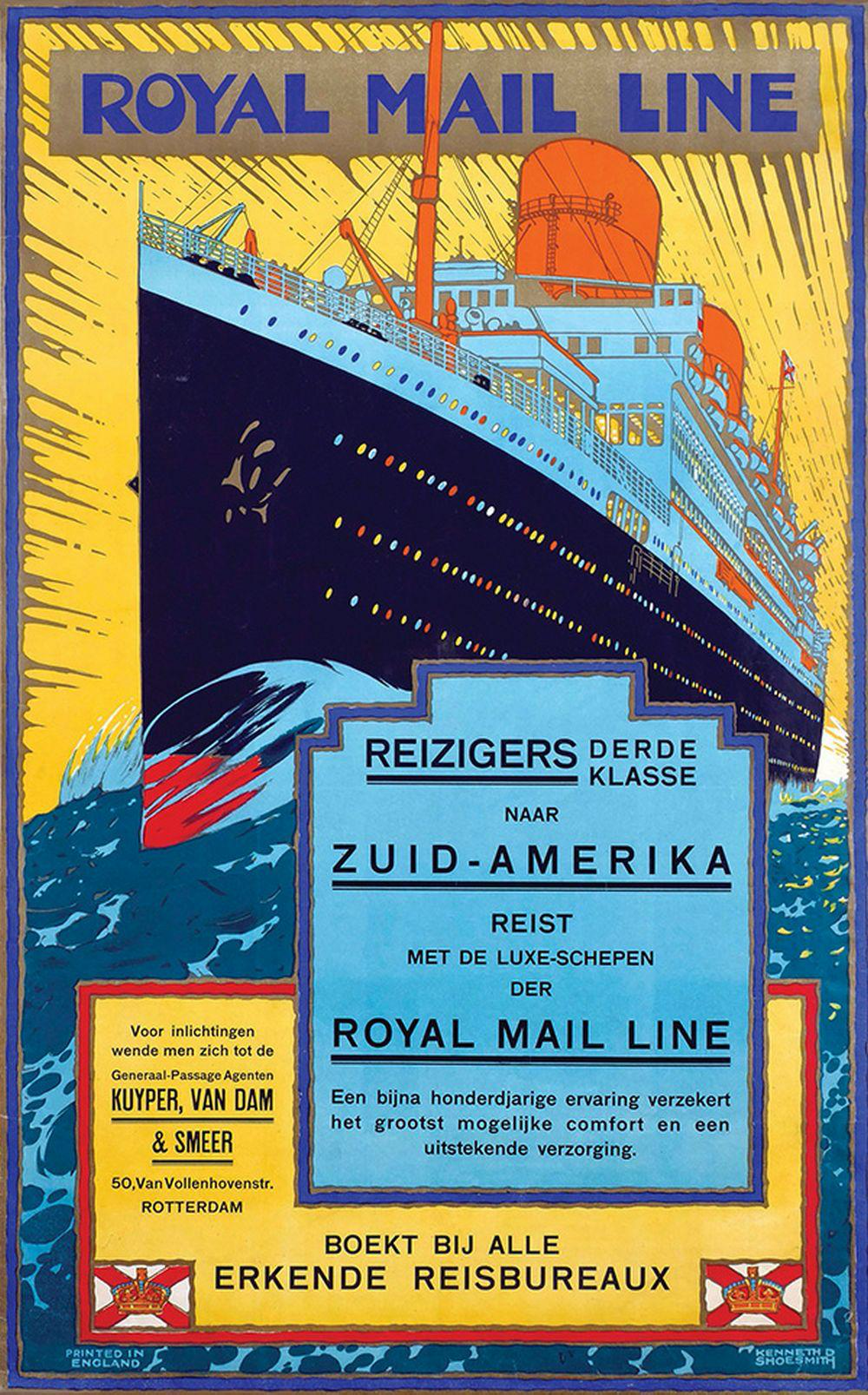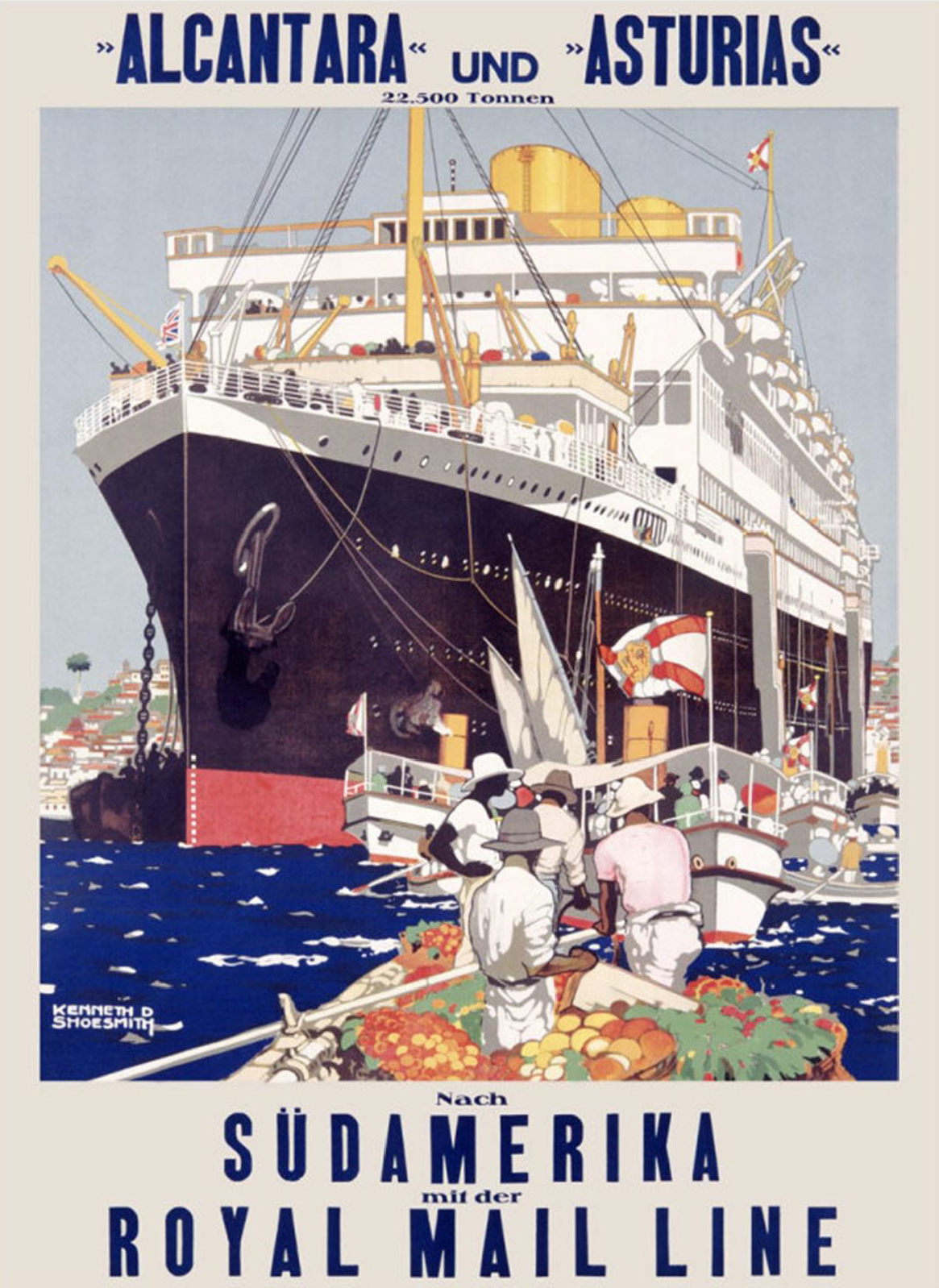 La época dorada de los trasatlánticos durante la primera mitad del siglo XX coincidió con el auge de las láminas con ilustraciones en la publicidad. Las navieras de la época contrataron a los mejores diseñadores gráficos de su tiempo para dar a conocer sus innovaciones tecnológicas y promocionar el lujo, la modernidad y el progreso que representaban sus buques. Entre ellos hoy destacamos al inglés Kenneth D. Shoesmith y a las láminas que preparó para la Royal Mail Steam Packet Company, o como era conocida en España, la “Mala Real Inglesa”.