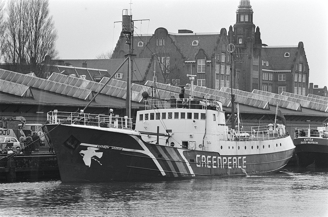 El primero de los buques de Greenpeace con ese nombre nació en 1955 en Aberdeen, como un arrastrero de 40 metros de eslora llamado Sir William Hardy. Se trataba del primer buque de propulsión diésel eléctrica construido en ese país, y sirvió al gobierno británico hasta su venta en 1977, año en el que fue adquirido por la organización ecologista por 40.000 libras. Tras ser reformado, el buque participó en todo tipo de campañas, desde la lucha contra la caza de ballenas y focas hasta la protesta contra las pruebas nucleares de finales de los setenta y comienzos de los ochenta En la medianoche del 10 de julio de 1985, durante una campaña en Nueva Zelanda en contra de las pruebas nucleares francesas en el Pacífico, un comando del servicio de inteligencia francés colocó una serie de cargas explosivas que provocaron dos explosiones a bordo del Rainbow Warrior, la segunda de ellas matando al fotógrafo Fernando Pereira y hundiendo el barco. Aunque fue reflotado, sus daños lo hacían irreparable, por lo cual volvió a ser hundido en las Islas Cavalli, en donde es usado como arrecife artificial para promover la vida marina y servir como un popular destino para las actividades recreativas de buceo.