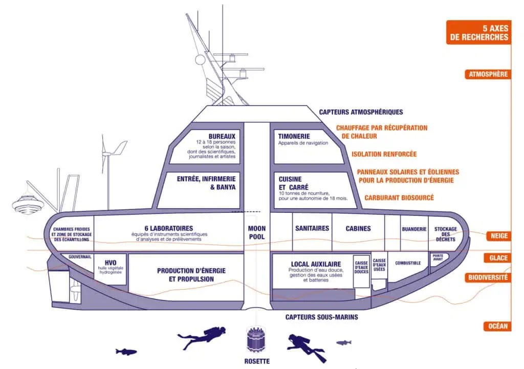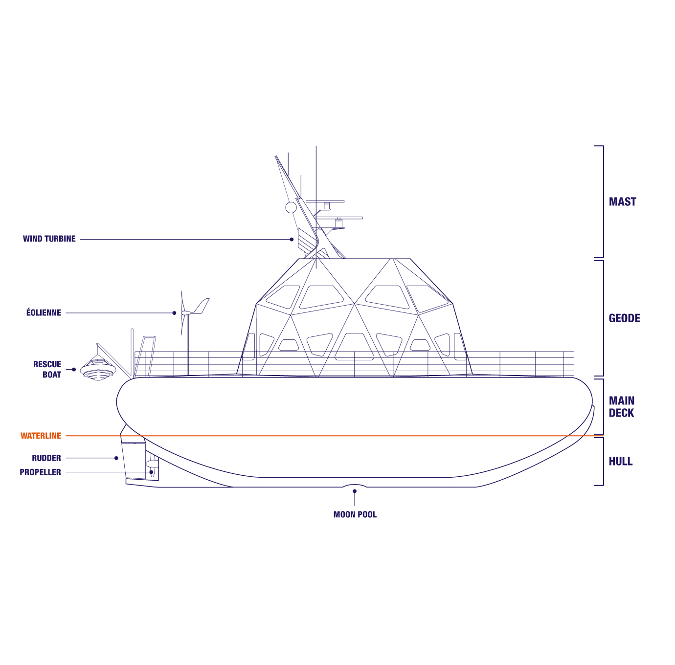 El resultado es una estructura ovalada de 26 metros de eslora por 16 metros de manga, con un calado de 2,3 metros y un peso muerto de 232 toneladas. La forma ovalada diseñada por Olivier Petit limita la presión ejercida sobre el casco cuando el buque queda atrapado en el hielo. Su estructura es de aluminio con un casco de 20 milímetros de espesor capaz de soportar la presión y el desgaste producido por el hielo, que cumple con la cota de clase de hielo ICE CLASS 1A SUPER del Bureau Veritas.