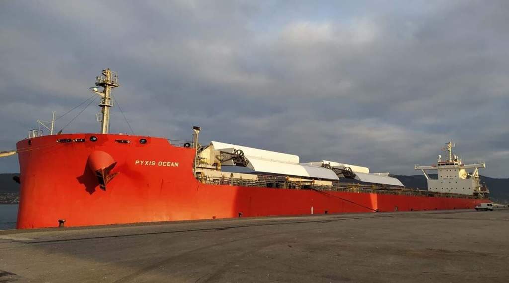 El “Pyxis Ocean” fue construido en 2017 en la el astillero de la Japan Marine United en Maizuru (Japón), con unas dimensiones de 229 metros de eslora por 32,26 metros de manga, bajo la clasificación Kamsarmax, buques capaces de transitar el canal de Panamá pero a la vez capaces de operar en la terminal portuaria de Kamsar (Guinea), en donde la carga principal de bauxita está limitada a buques de un máximo de 229 metros de eslora.